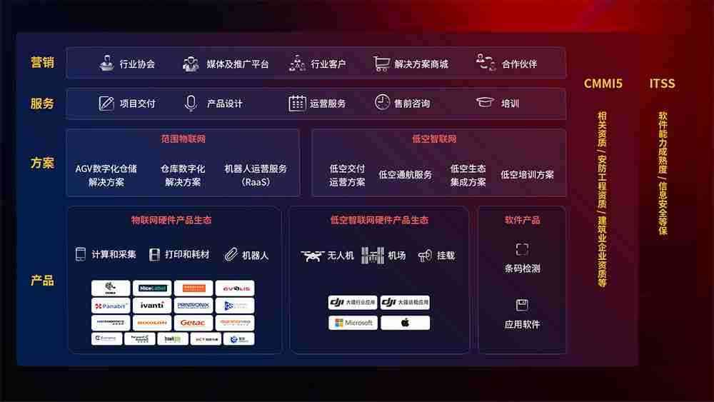 聚合国内外先进的物联网硬件产品品牌,,,聚焦数字化仓储、、、、机器人运营、、、、低空智联网等领域,,共同打造适合客户业务场景的解决方案并提供交付服务
